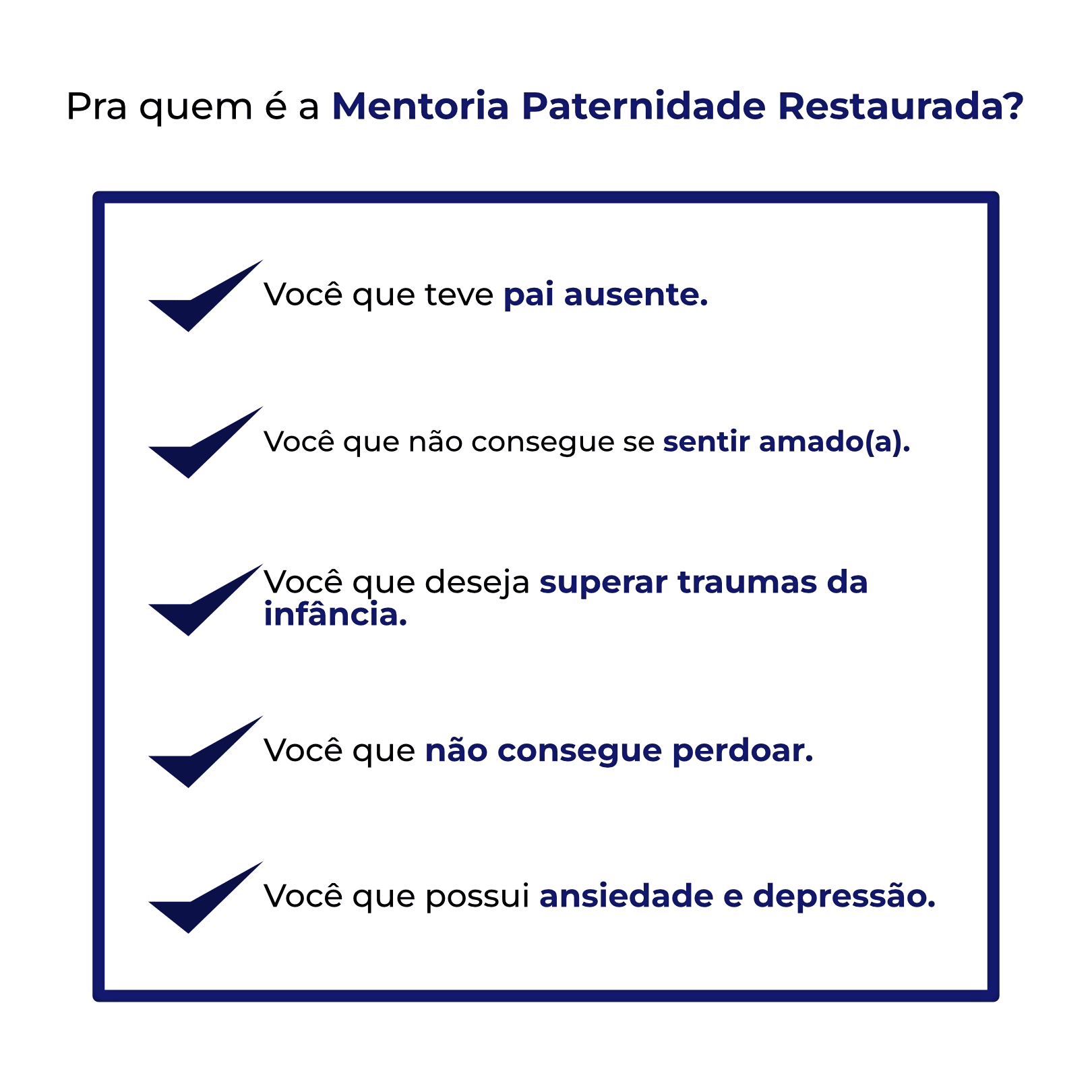 Uma MENTORIA COMPLETA para você viver uma vida que vale a pena ser vivida, de forma leve e sem traumasA Mentoria Paternidade Restaurada tem como objetivo te mostrar como é possível viver uma vida livre de feridas e traumas. Como você pode colocar isso em prática de imediato, e resolver tudo que vem travando e bloqueado a sua vida.Veja o que você irá aprender: