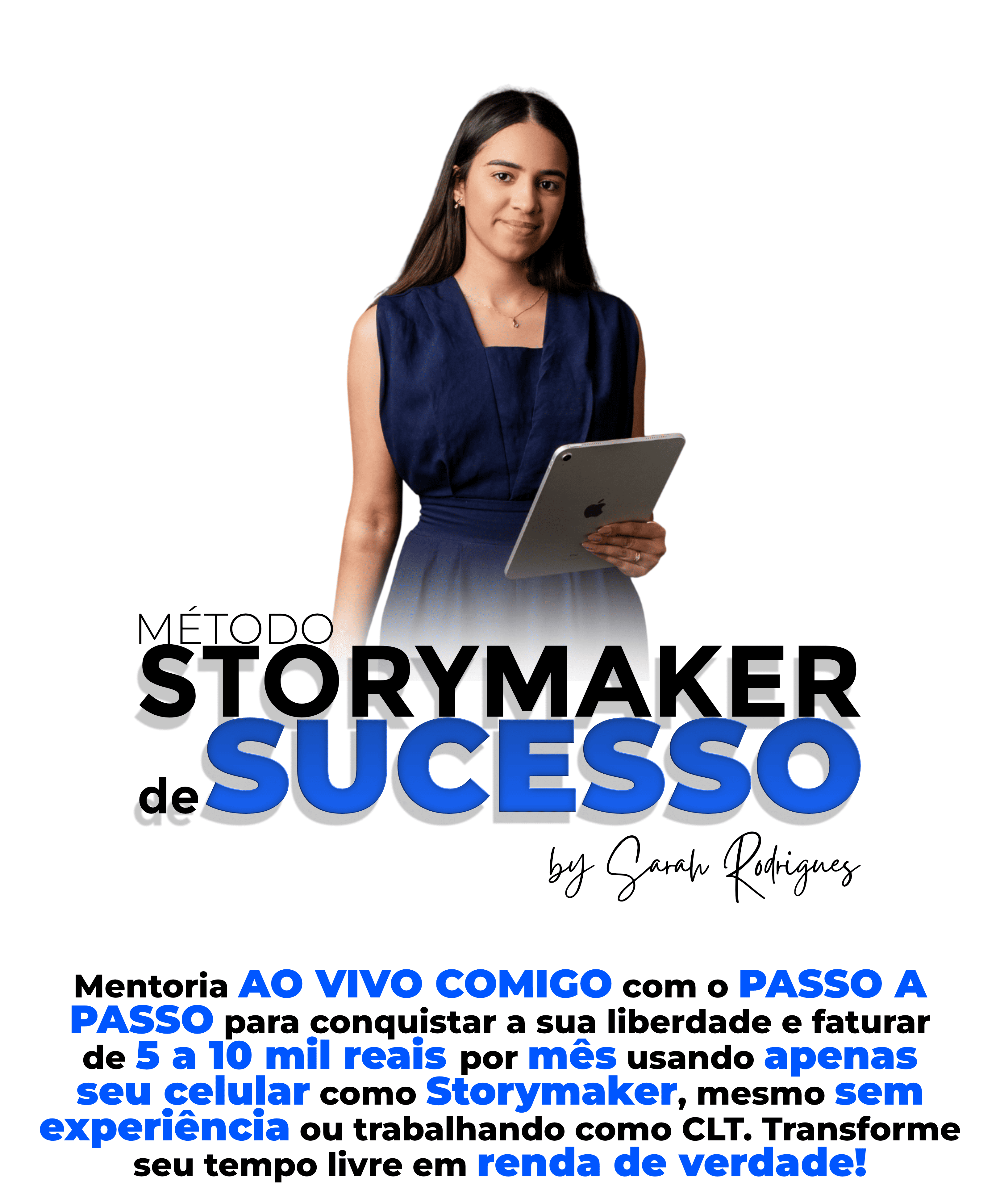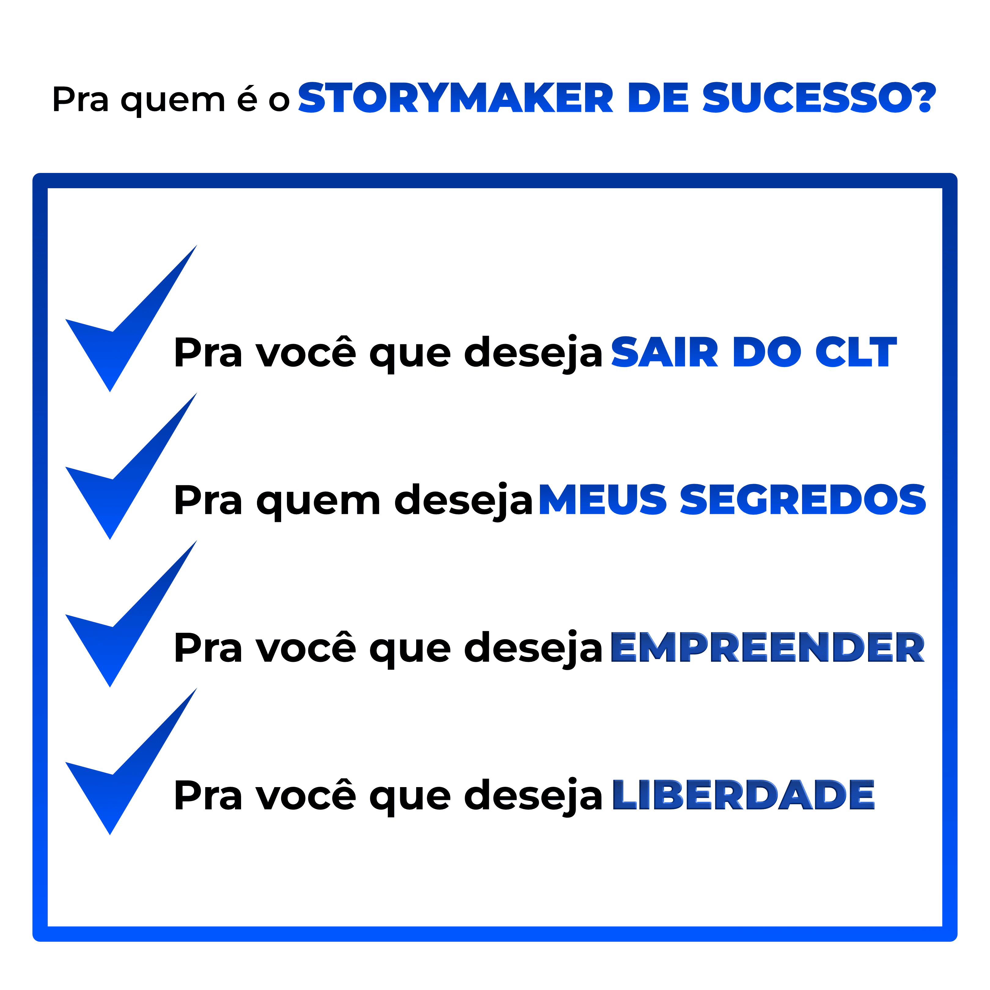 Uma mentoria AO VIVO passo a passo 100% PRÁTICO e RÁPIDO para você empreender como Storymaker com o que já tem em mãos O Storymaker de Sucesso tem como objetivo te dar a base para empreender como Storymaker para faturar muito trabalhando com seu celular, tendo liberdade geográfica e financeira. Ele também tem o objetivo de revelar meus segredos e estratégias, para não perder tempo nem dinheiro. Veja o que você vai aprender: